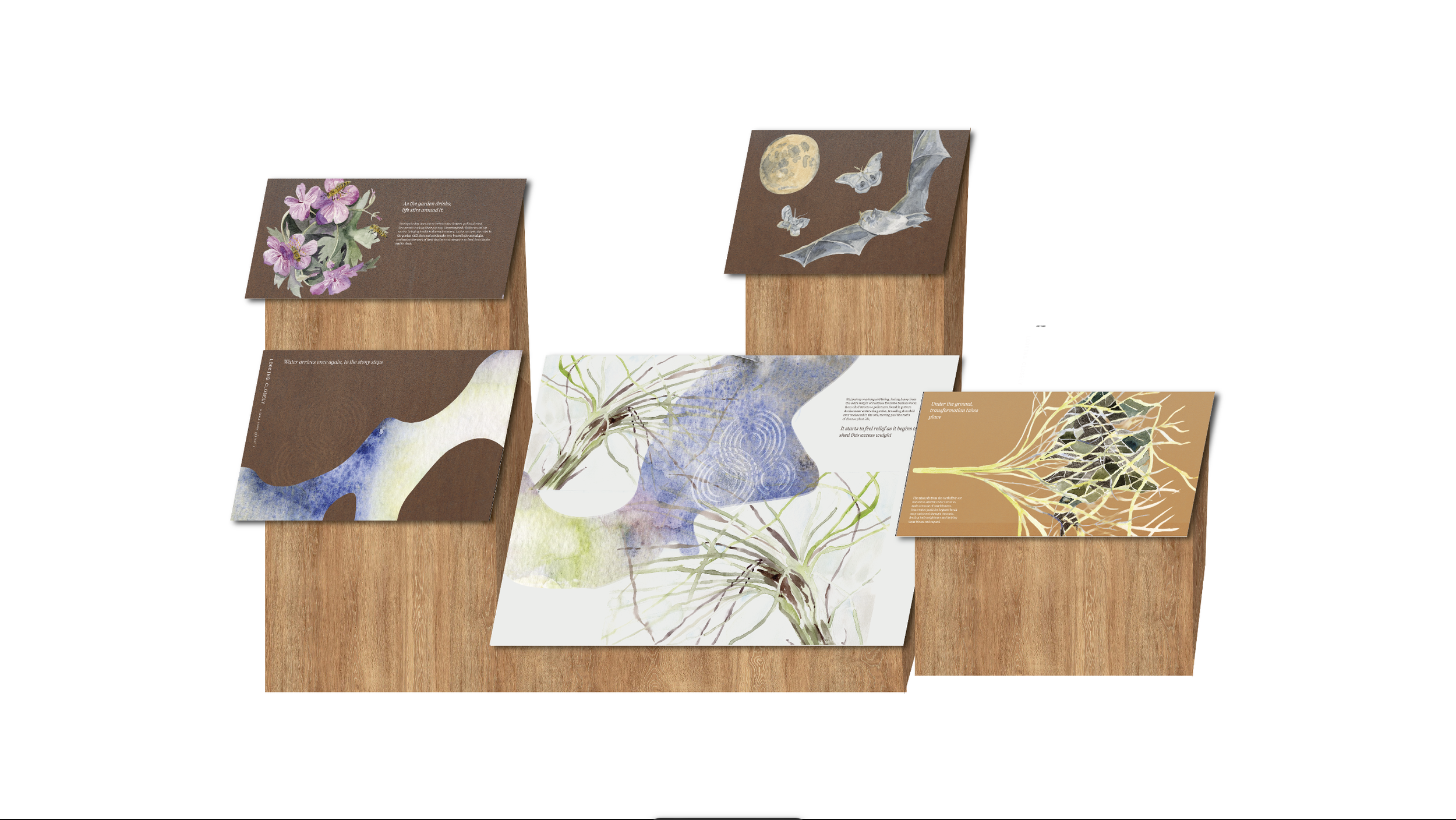Under the ground, transformation takes place, the minerals from the earth filter out the toxins and the water becomes again a source of nourishment. Some water particles begin to break away and travel through the roots, feeding leafy neighbours and helping them bloom and expand.